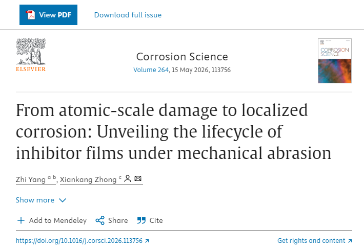 近日,我院杨志副教授以第一作者身份在国际腐蚀领域顶级期刊《Corrosion Science》(中科院一区,影响因子8.5)上发表最新研究成果From atomic-scale damage to localized corrosion: Unveiling the lifecycle of inhibitor films under mechanical abrasion”,四川文理学院为该成果第一完成单位。论文链接:https://doi.org/10.1016/j.corsci.2026.113756.