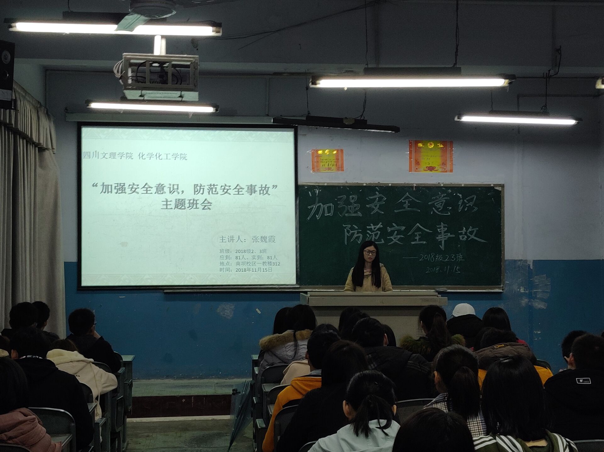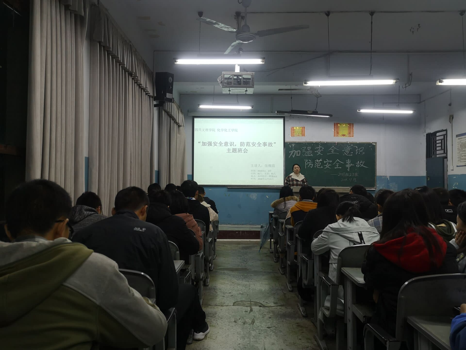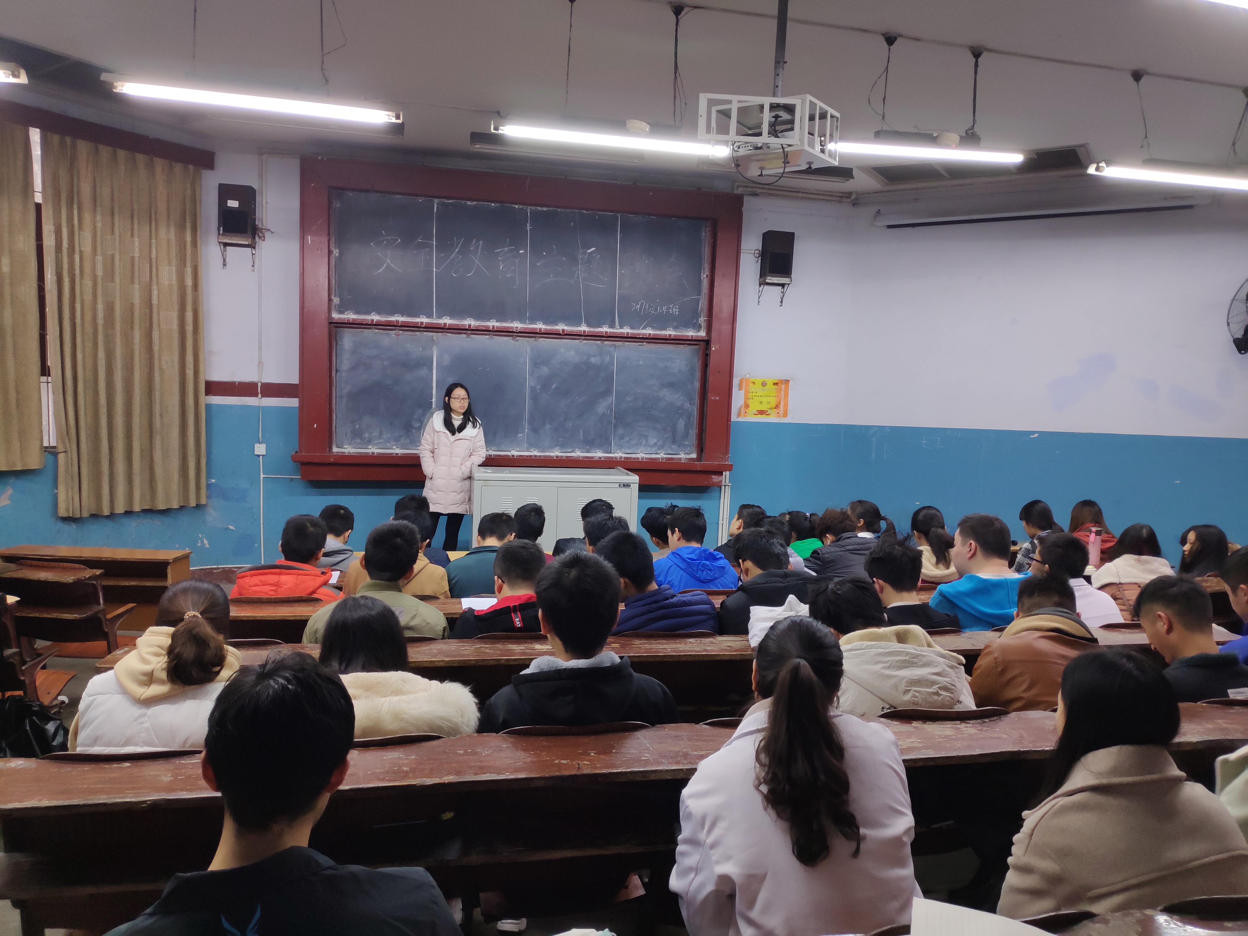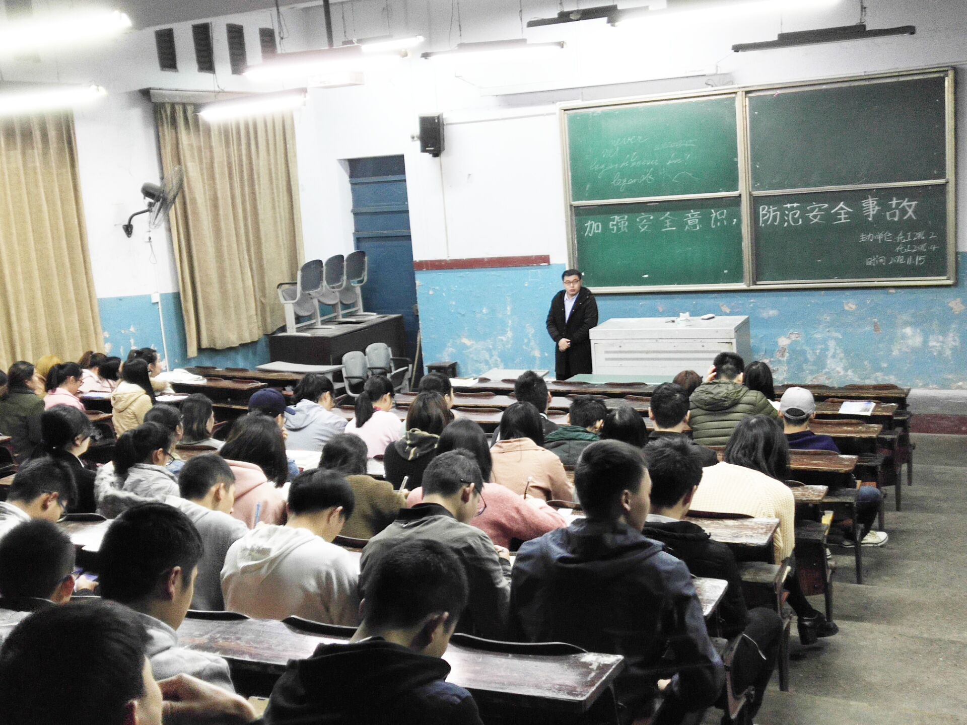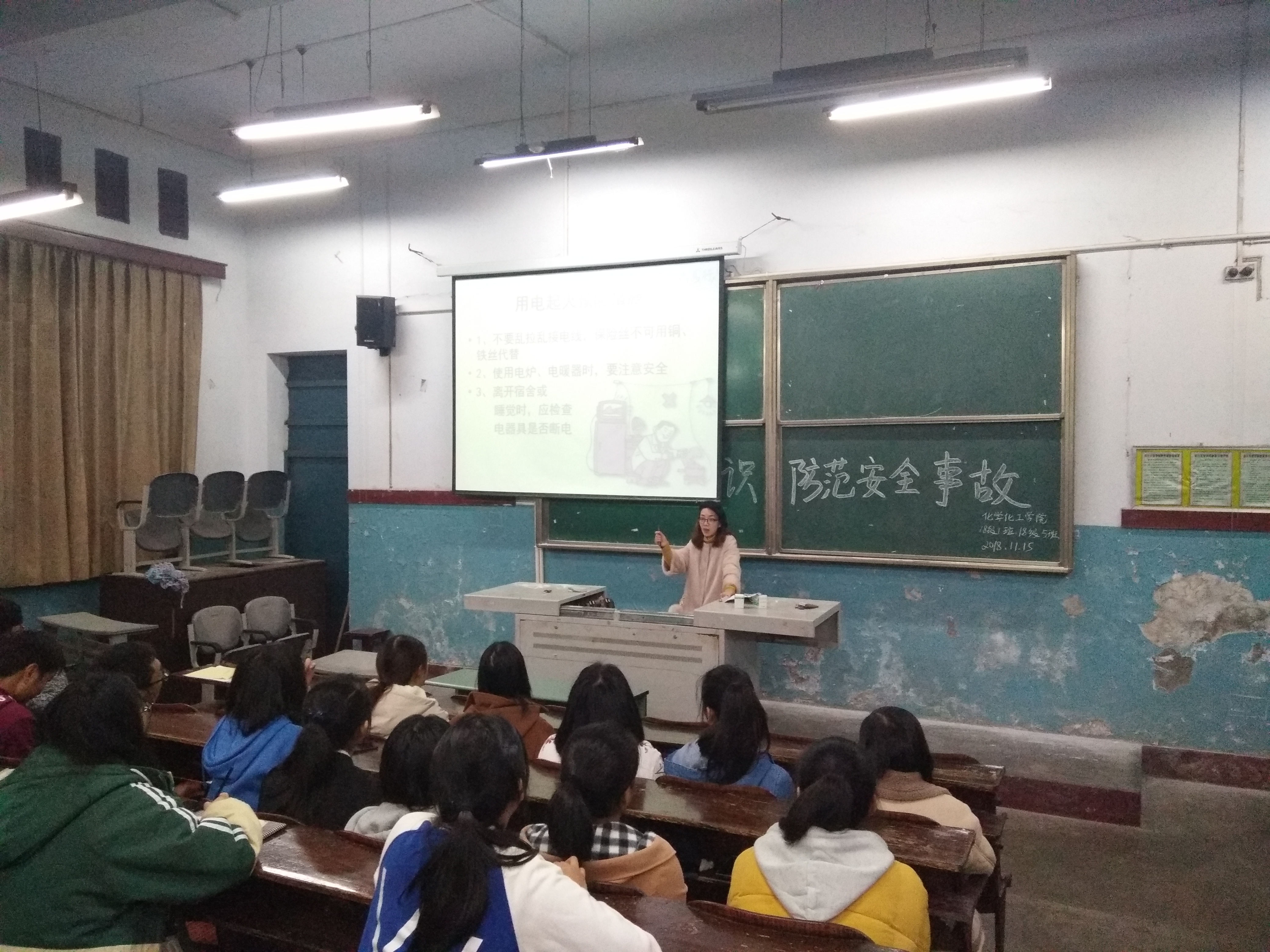 11月15日,各班召开了安全教育主题班会,在各班班会上,辅导员老师以有关校内校外人身财产的重大安全事故实例,为大家讲解了消防安全、交通安全、日常生活安全、校园活动安全以及在自然灾害中的自我保护和意外事故的处理方法等安全知识。