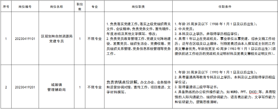 2. 本次公开招聘全程接受社会监督,岗位20230419101(区规划和自然资源局党建专员)监督举报电话:028-83306011;岗位20230419201(城厢镇管理辅助岗)监督举报电话:028-68936384。
